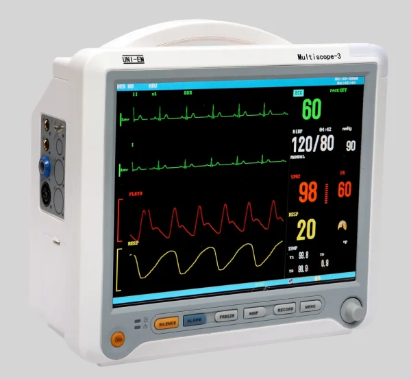 The UNI-EM Multiscope 3 is a portable, high-performance multiparameter monitor designed for hospitals and clinical settings. Featuring a 12.1-inch TFT display, it delivers real-time monitoring of SPO2, NIBP, ECG, Temperature, and RESP with flawless accuracy—even in low perfusion and motion conditions.